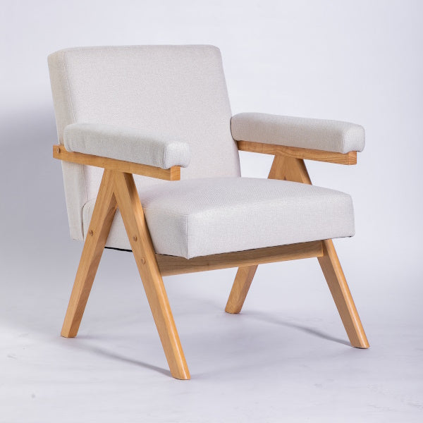 Incorpora la calidez del diseño nórdico con esta butaca de madera maciza en elegante color roble. Su tapizado en tela beige, acompañado de un confortable relleno de espuma, brinda un asiento acogedor. Los reposabrazos tapizados añaden un nivel extra de comodidad, haciendo de esta butaca la elección perfecta para salas de estar, salones de estudio y dormitorios.