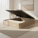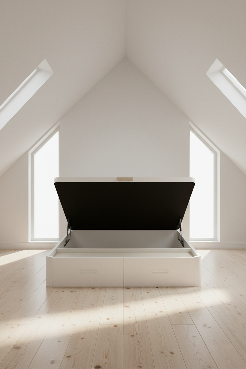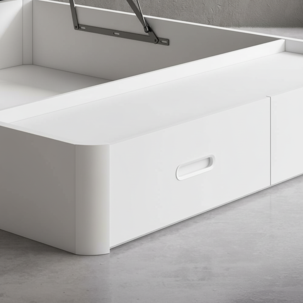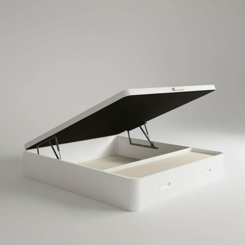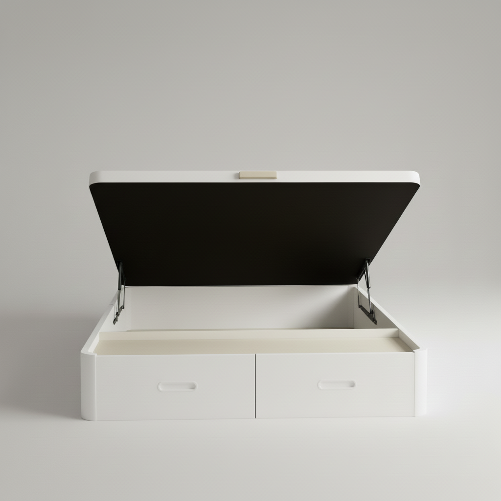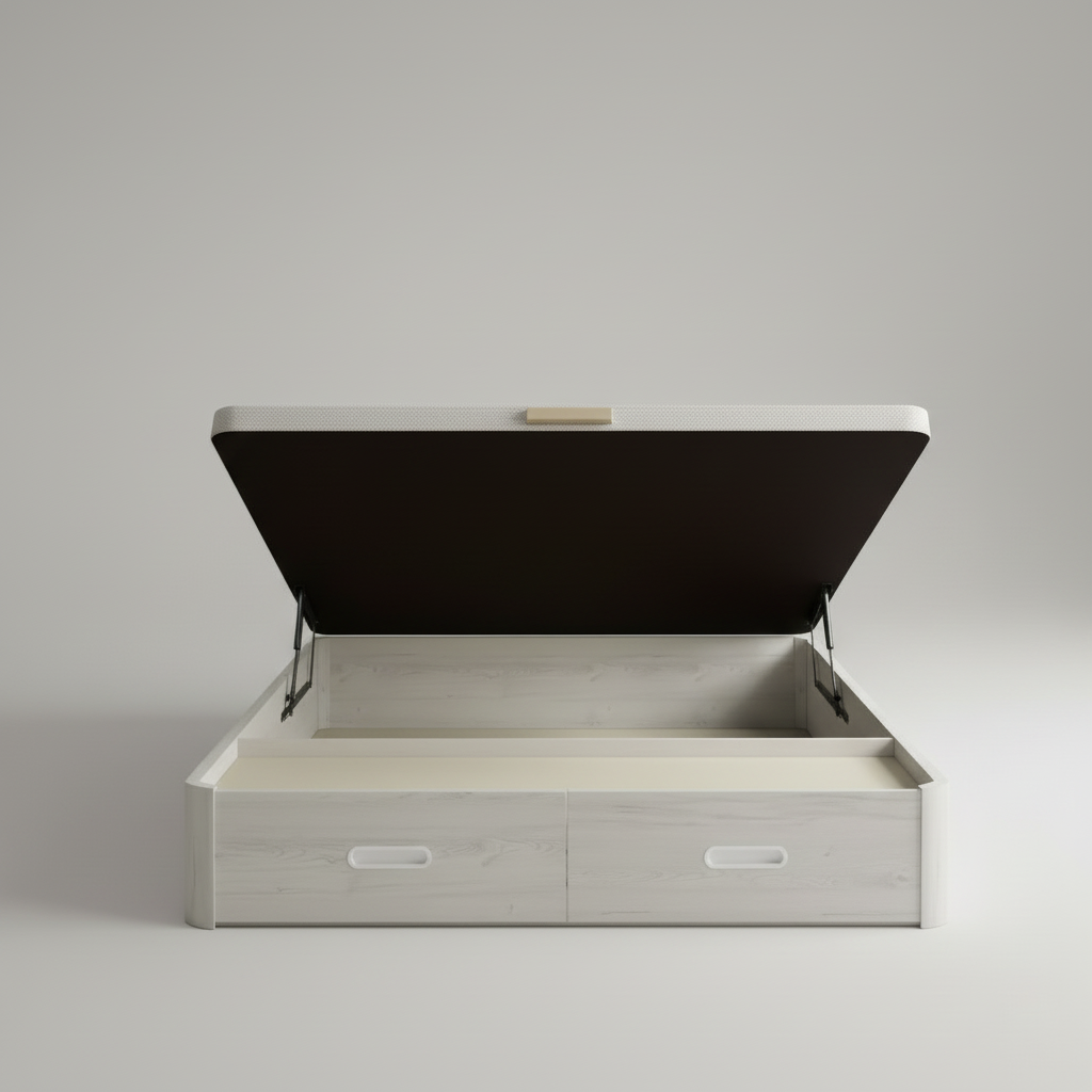 La tapa tapizada 3D transpirable con sus 4 válvulas airedoras garantiza una ventilación perfecta para tu colchón. Además, el sistema de apertura frontal con pistones hidráulicos de alta potencia asegura un uso suave y sin esfuerzo, compatible con cualquier tipo de colchón. Sus dos esquinas redondeadas de madera maciza previenen accidentes y tropiezos.