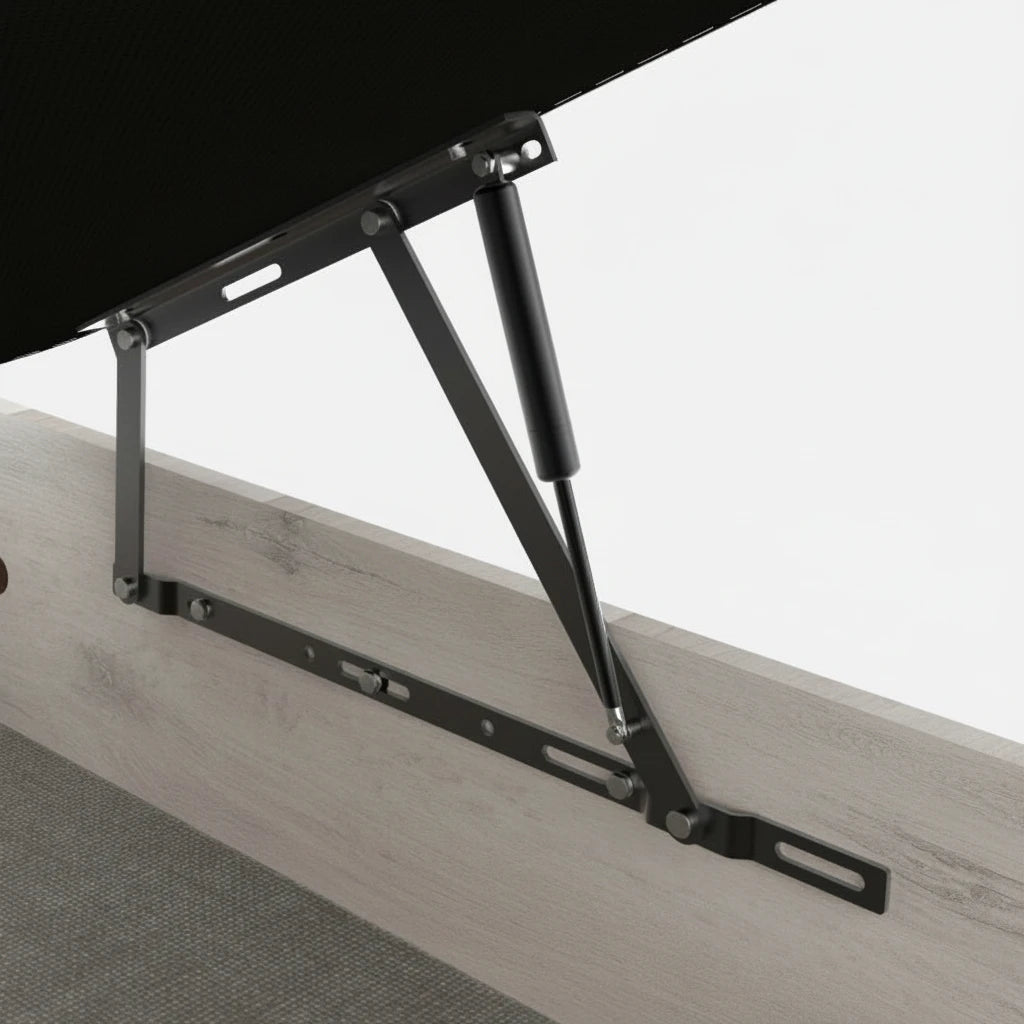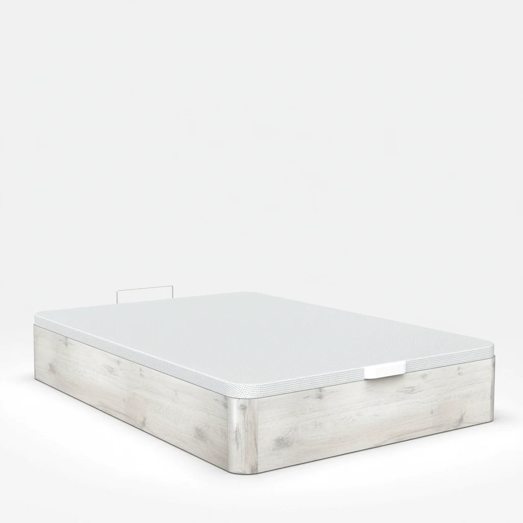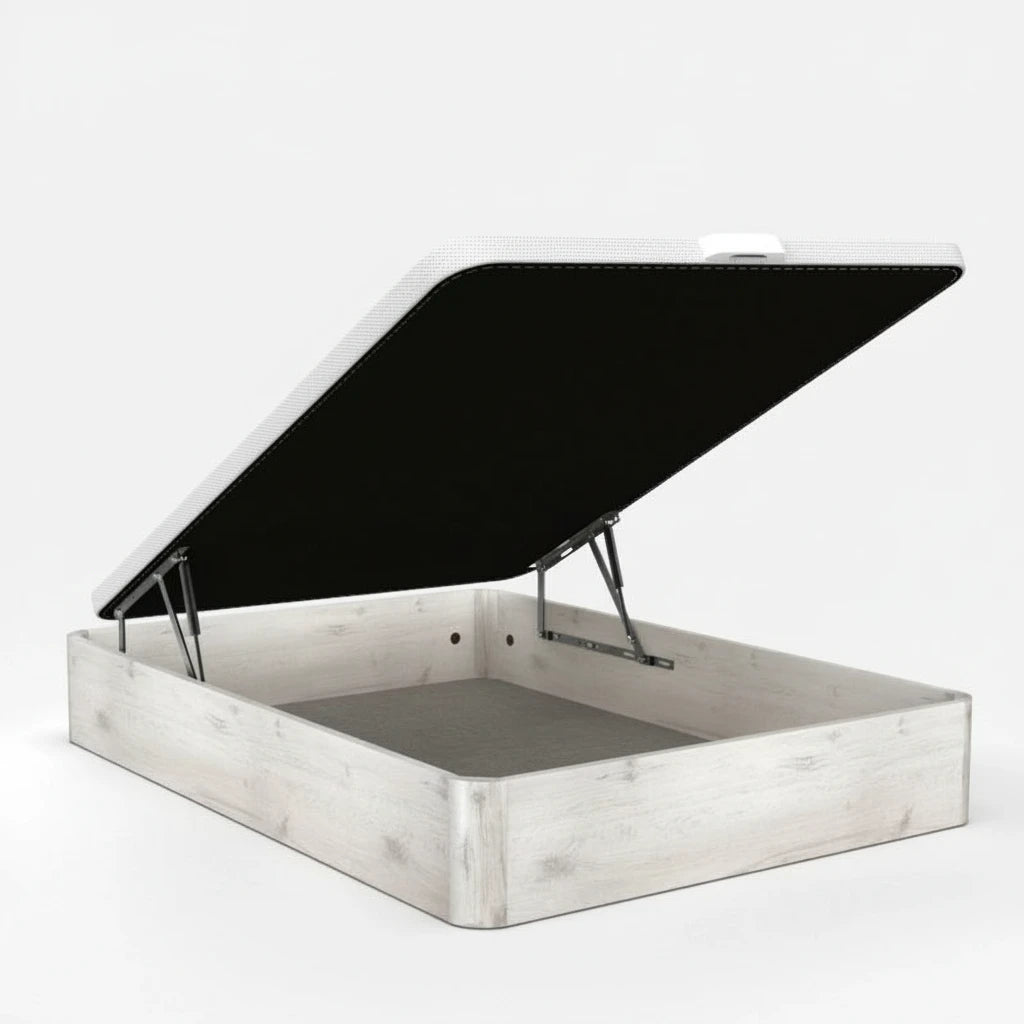 La tapa tapizada 3D transpirable no solo añade un toque estético, sino que también garantiza una ventilación adecuada para tus colchones. Además, el sistema de apertura frontal con pistones hidráulicos de alta potencia asegura un uso suave y sin esfuerzo, compatible con cualquier tipo de colchón. Sus cuatro esquinas redondeadas de madera maciza lacada no solo previenen accidentes, sino que también aportan un acabado elegante.