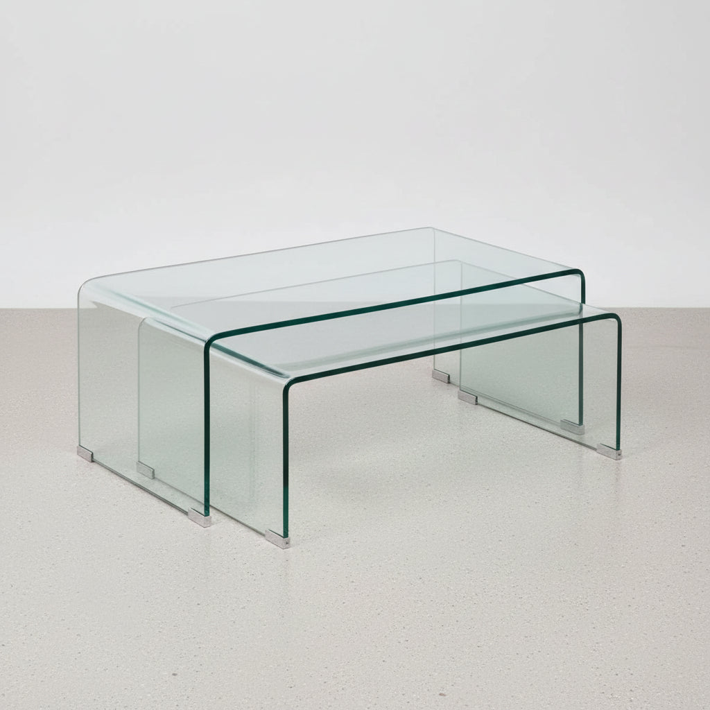 Te presentamos el nuevo set de mesas nido Volcano, un juego de 3 mesitas auxiliares de diseño nórdico fabricadas íntegramente en cristal curvado de 12 mm de espesor. Su acabado es totalmente transparente y su diseño está formado por sola pieza robusta y resistente a las ralladuras. La mesa auxiliar o de centro Volcano tiene un estilo de líneas rectas con extremos redondeados. Ideal para espacios reducidos, favoreciendo la luz y sensación de amplitud en tu hogar.