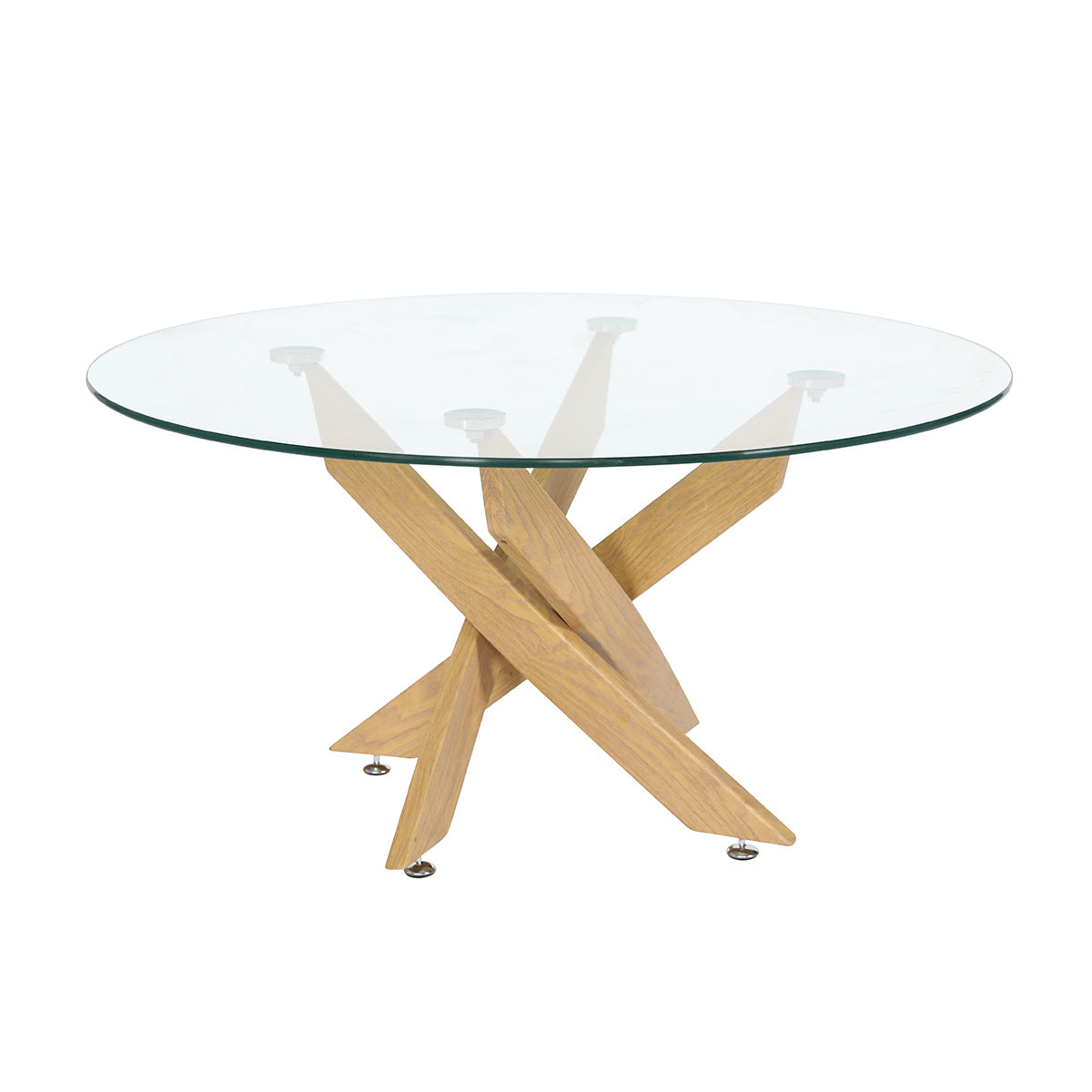 Está fabricada con tapa en cristal de 8 mm de grosor, y estructura metálica negro, cromado o madera, unida al cristal mediante pletinas metálicas aportando resistencia y durabilidad. Su forma redonda elegante y sofisticada cuenta con unos acabados impecables, ya que está fabricada con materiales de alta calidad.
