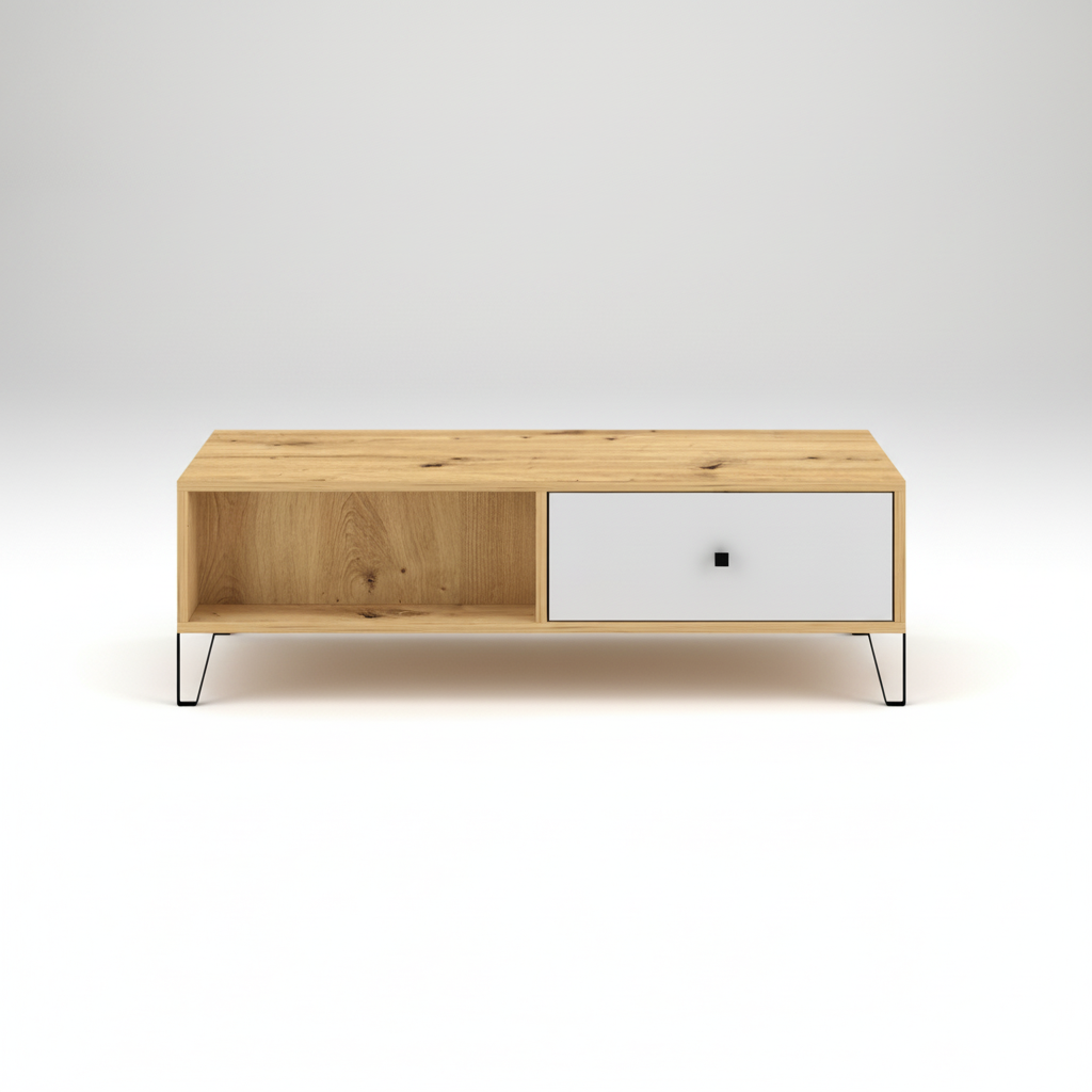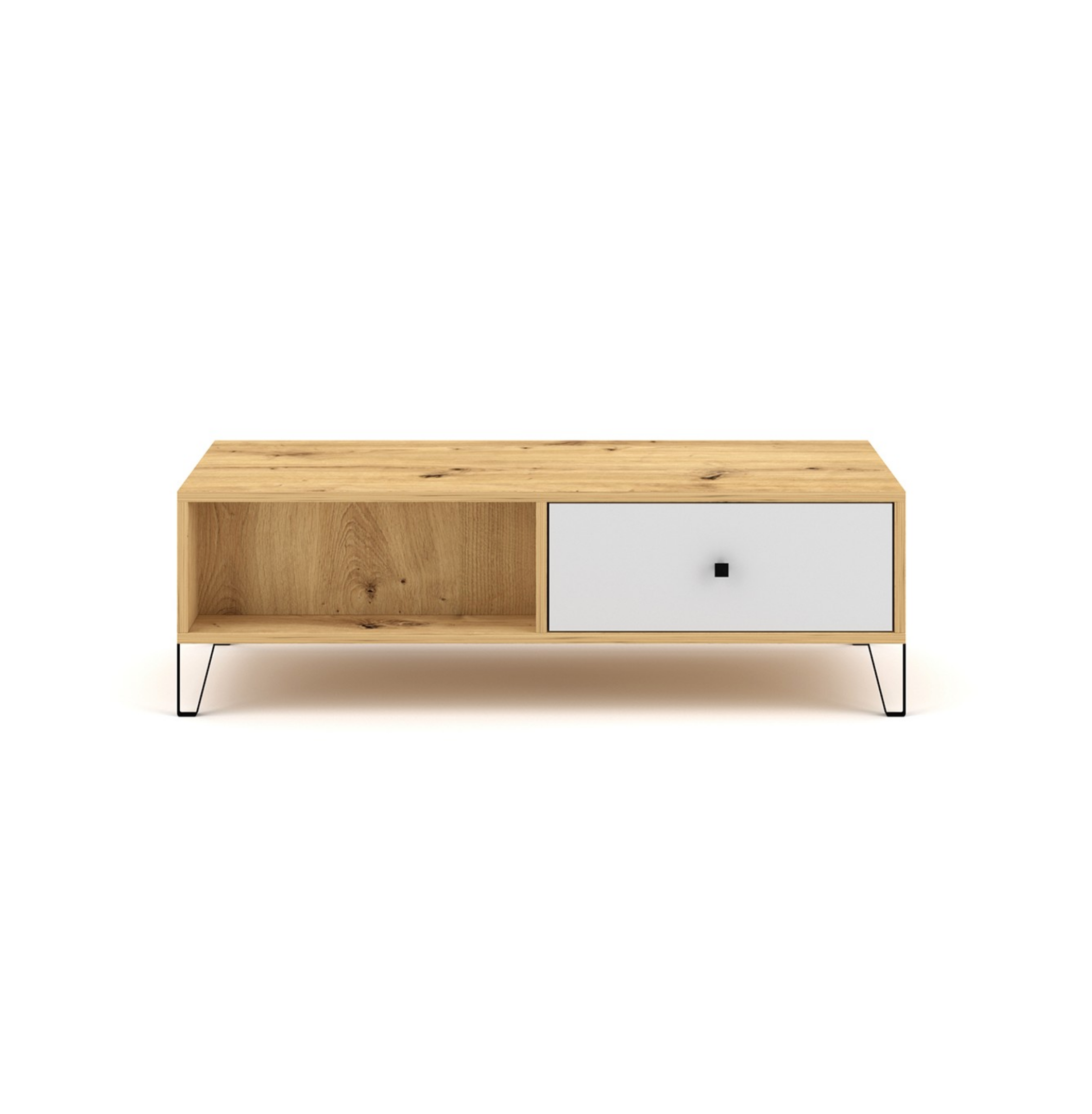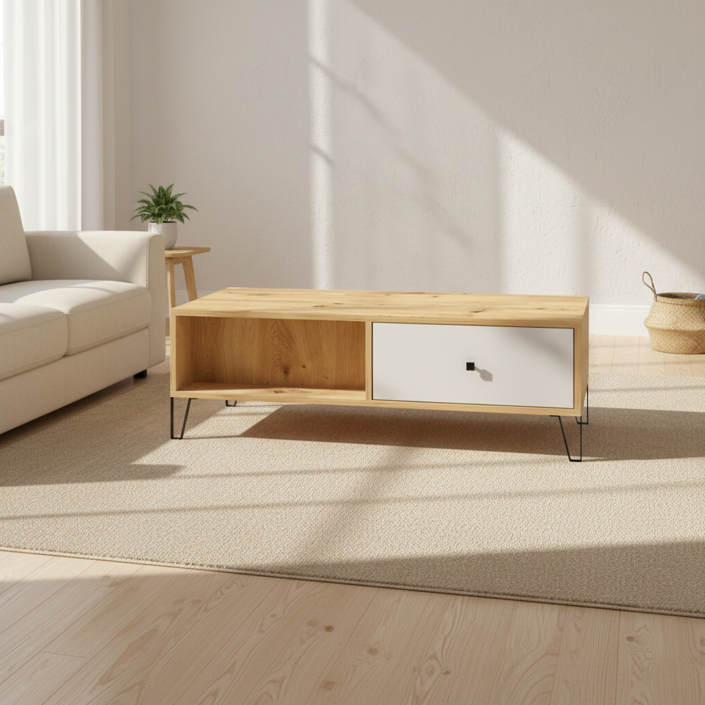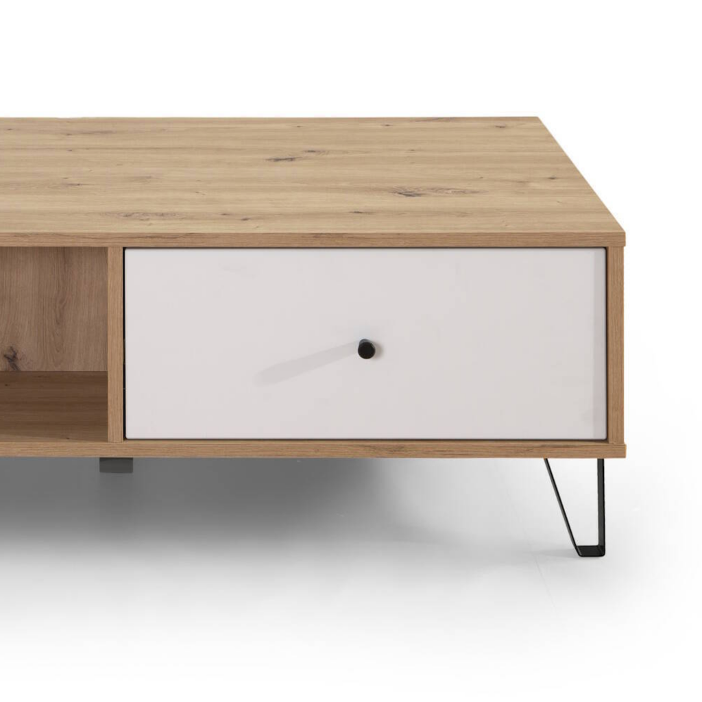 Eleve su salón con la mesa de centro SUECIA en roble artesanal y blanco. Esta elegante mesa de centro no sólo sirve como pieza central para su zona de asientos, sino que también ofrece un amplio almacenamiento con dos estantes y dos cajones. Sus dimensiones proporcionan un perfecto equilibrio entre utilidad y diseño, con un acabado en roble claro y blanco que ilumina la estancia y le confiere un aire de sofisticación contemporánea.