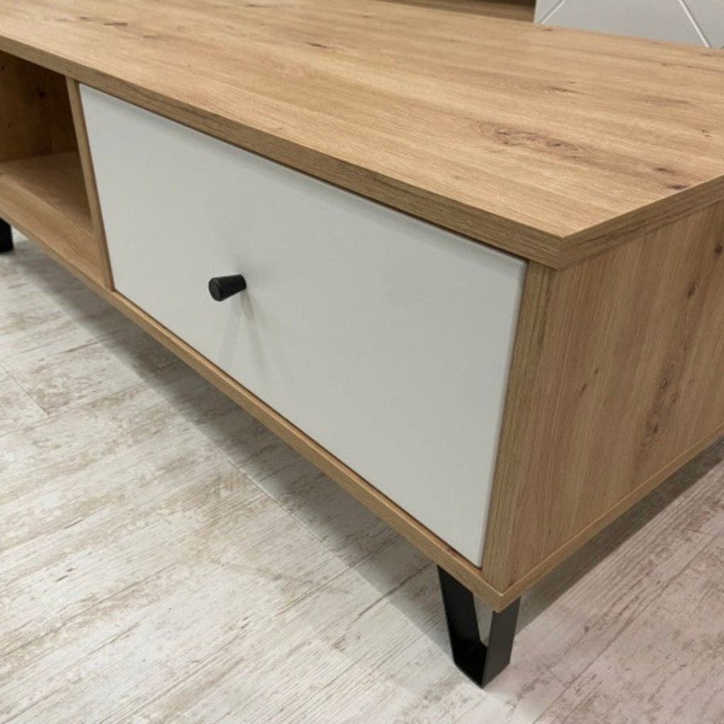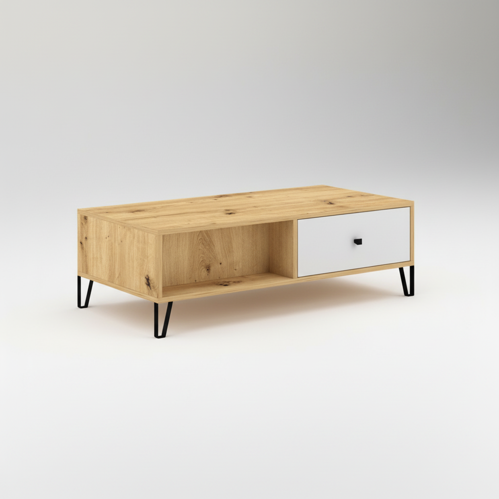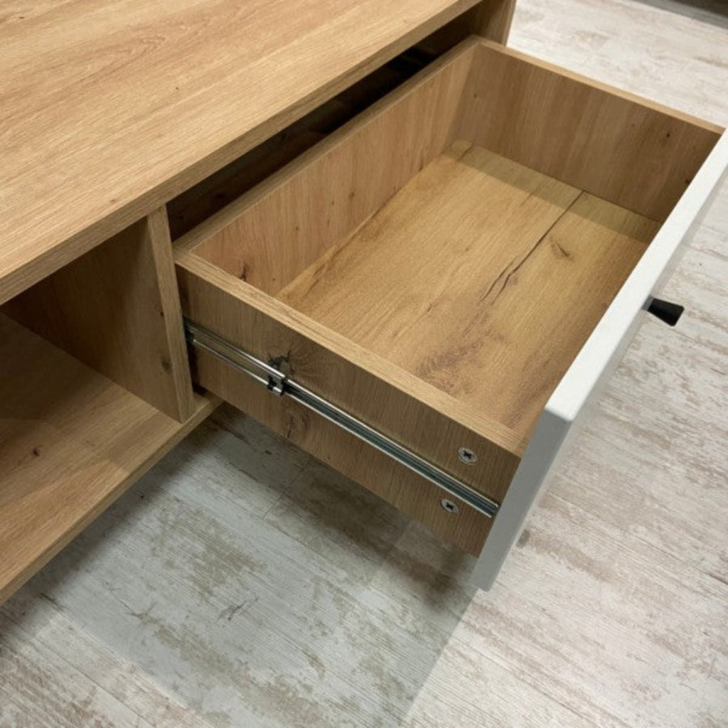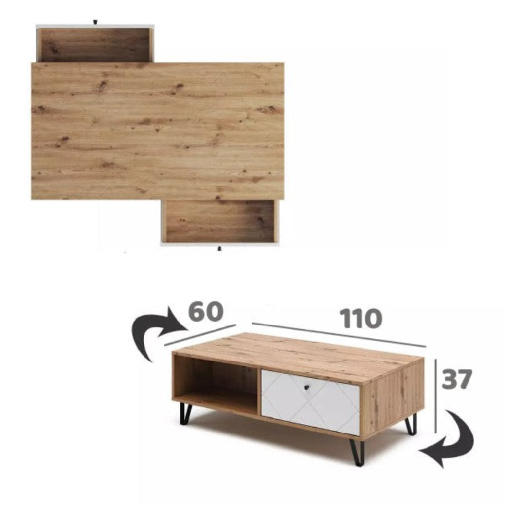 Eleve su salón con la mesa de centro SUECIA en roble artesanal y blanco. Esta elegante mesa de centro no sólo sirve como pieza central para su zona de asientos, sino que también ofrece un amplio almacenamiento con dos estantes y dos cajones. Sus dimensiones proporcionan un perfecto equilibrio entre utilidad y diseño, con un acabado en roble claro y blanco que ilumina la estancia y le confiere un aire de sofisticación contemporánea.