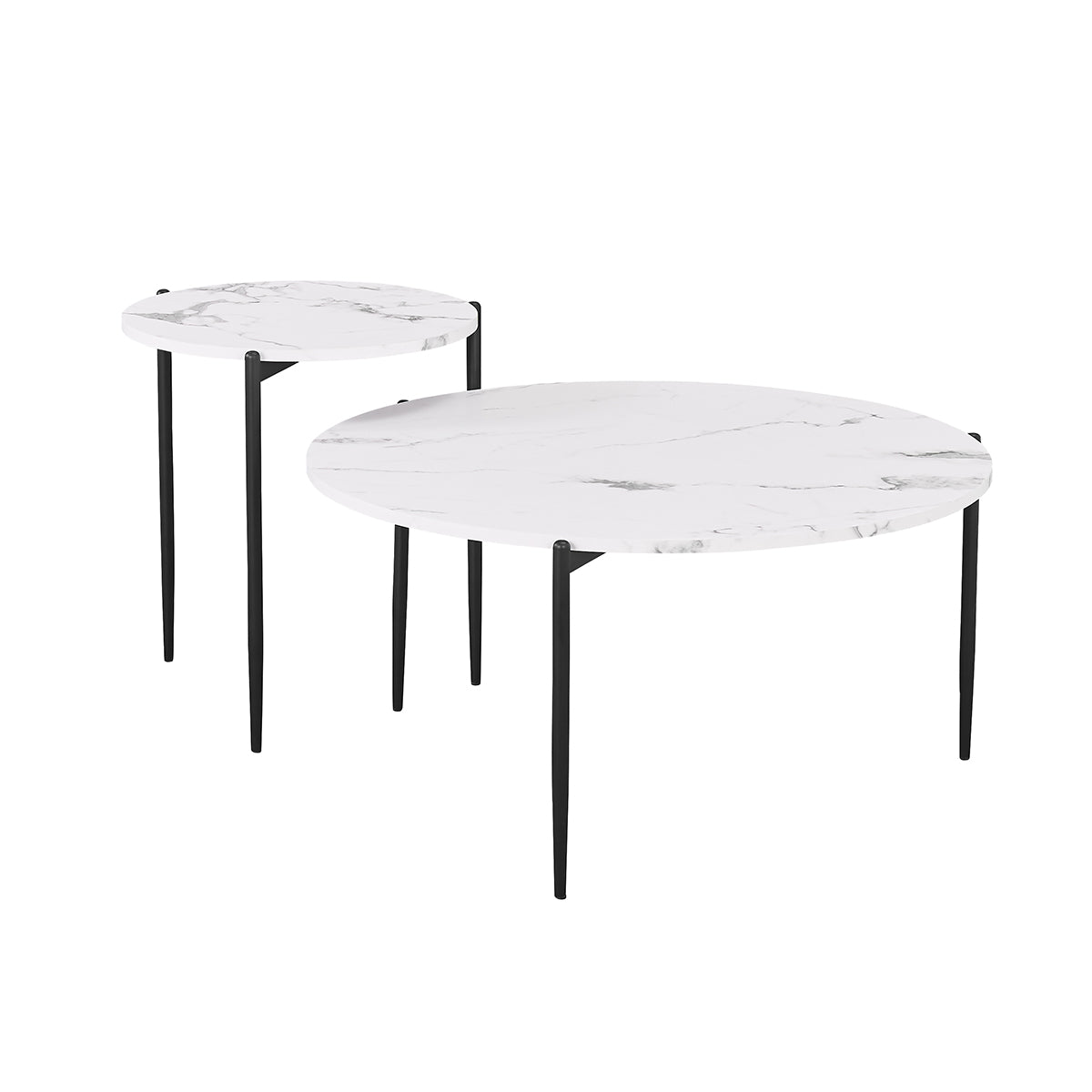 La Mesa de centro Turín, está compuesta por 2 mesas auxiliares de diferentes tamaños y alturas con las que puedes jugar a la hora de decorar tu espacio. Con su diseño acabado en MDF imitación mármol en color blanco, negro con vetas o vidrio la combinación te da amplias posibilidades decorativas para otras estancias, mejorando la imagen de cualquier alfombra o parquet. Sus patas metálicas en color negro cuentan con un diseño moderno y actual en las dos mesas donde podras ordenar los objetos que quieres tener mas a mano.