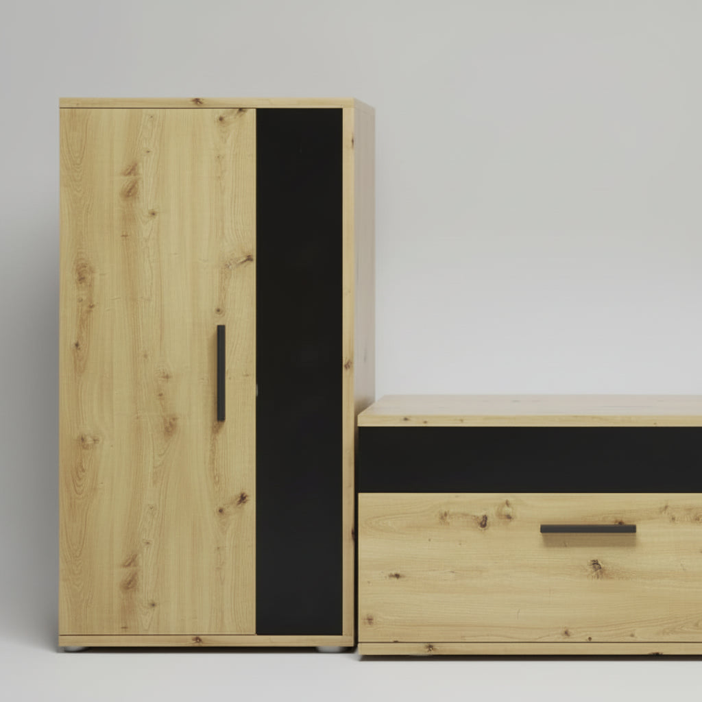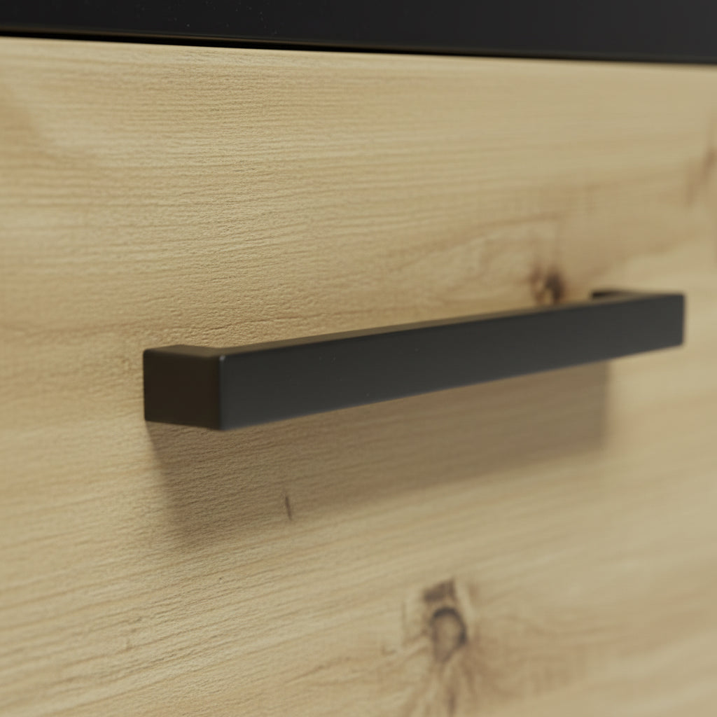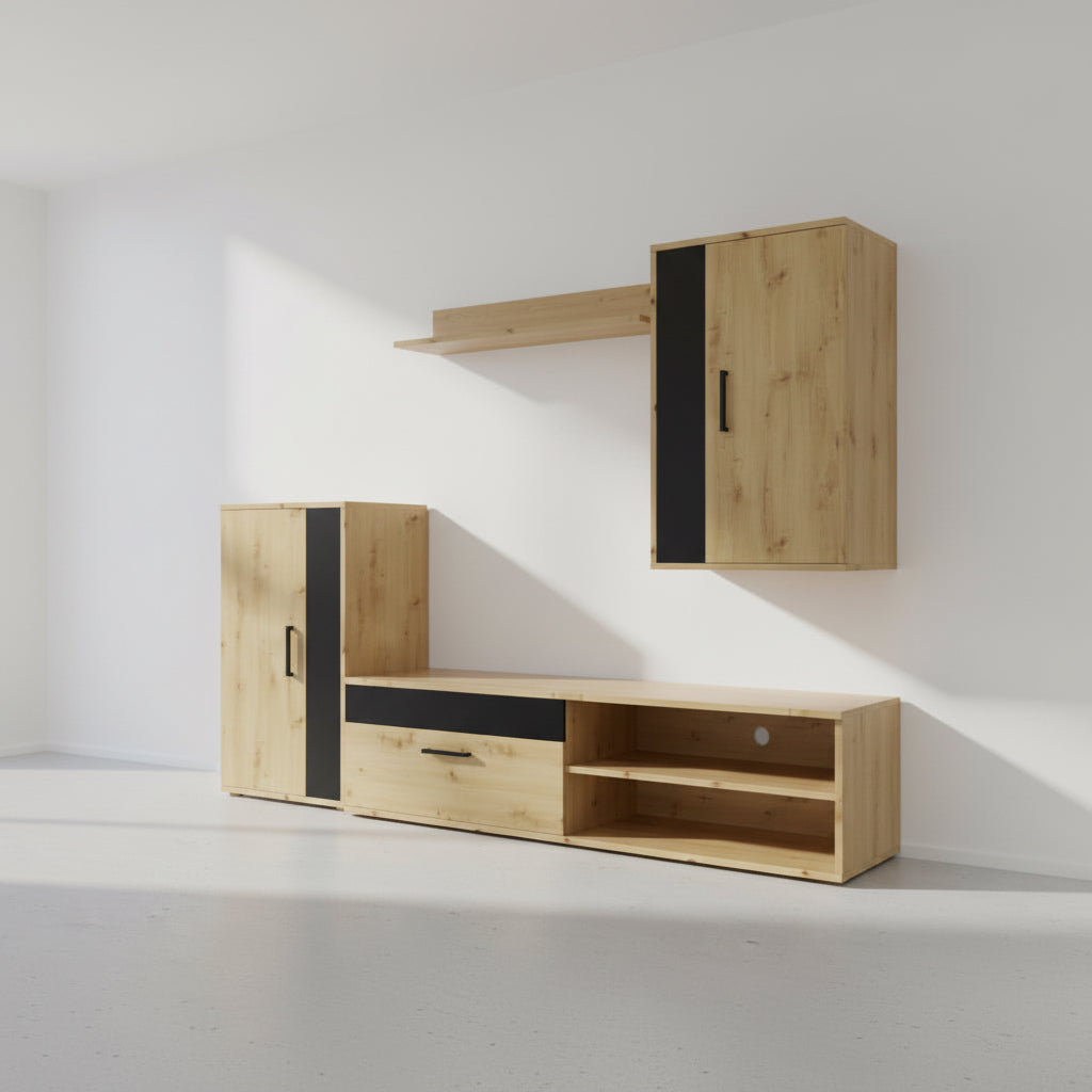Renueva tu sala con este mueble de TV modular de diseño moderno, ideal para crear un ambiente elegante, ordenado y funcional. Su combinación de acabado en madera natural con detalles en negro mate aporta un estilo contemporáneo que se adapta a diferentes tipos de decoración. Tiradores de PVC en color negro. Resistente a arañazos, golpes, altas temperaturas y humedad.